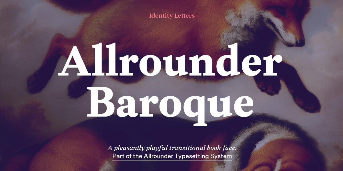 Allrounder Baroque is a transitional serif member of the Allrounder superfamily. A playful and dynamic medium-contrast typeface, its lush shapes guide the reader’s eye across the page.