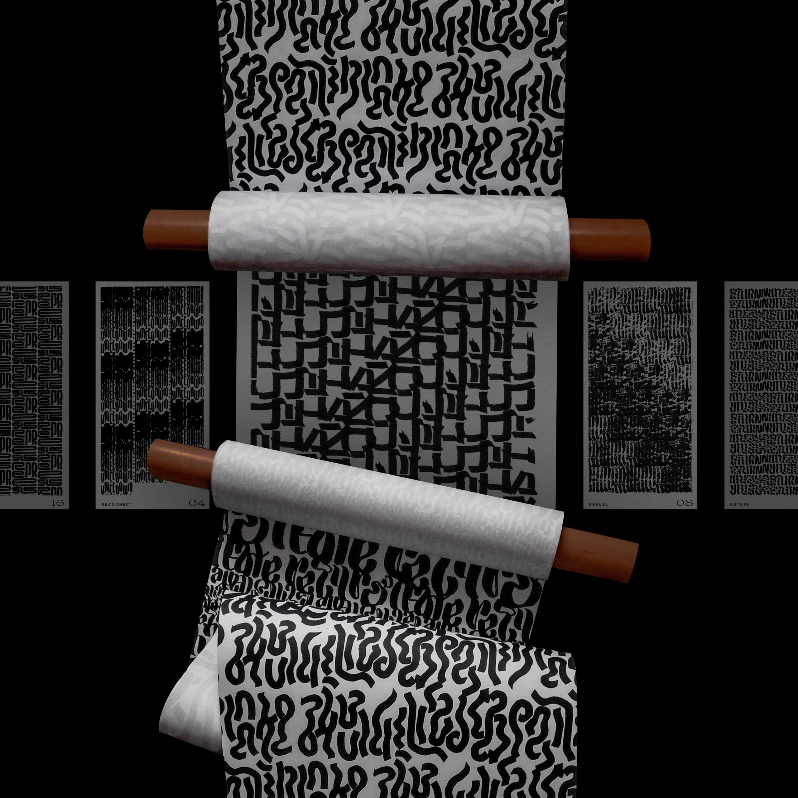 'Mantras' is a pattern collection that reflects on the intrapersonal effects of lockdowns. Using my diaries as a starting point, I assigned a word to describe my weeks for a year; each prefixed by 're' as a nod to the repetitive nature of both the patterns and life during quarantine. I chose calligraphy as a way to turn these words into an exploration of patterns, type and legibility, as well as a tool for processing this period. These patterns serve as a subjective timeline of 52 weeks.