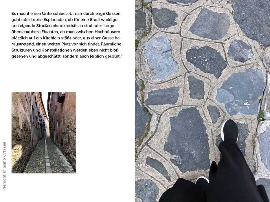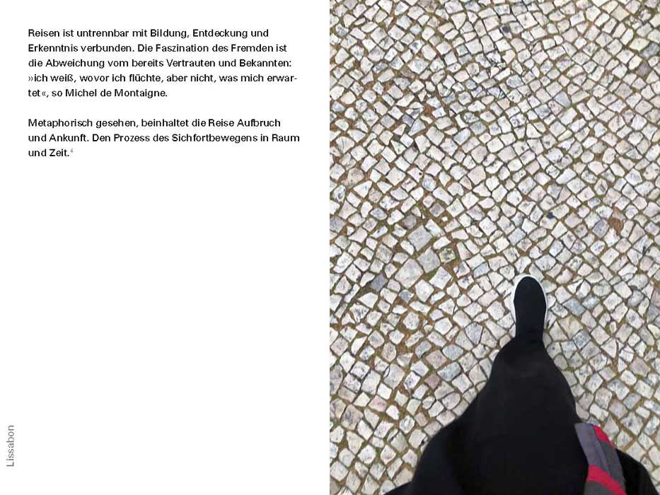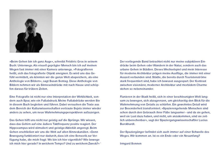 “My footprints will accompany and guide you through this book,” writes Irmgard Sonnen. The texts repeatedly attempt to view familiar subjects differently in order to reveal new perspectives of perception. Thus we read in Michel de Montaigne: “My thoughts fall asleep when I sit. My mind does not move forward unless my legs set it in motion.”