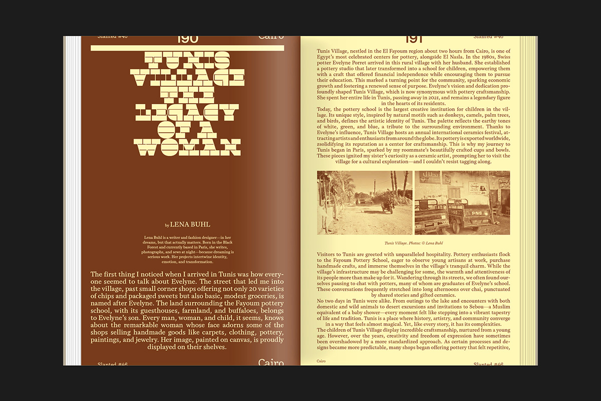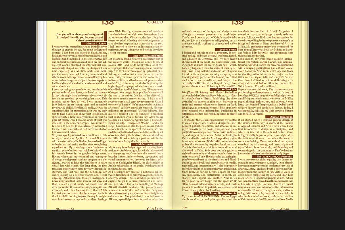 Slanted Magazine #46—Cairo is a compelling portrait of a design scene in motion—bold, diverse, and brimming with fresh perspectives. On our trip to Cairo, we conducted numerous interviews with people from the creative industries, which are being edited into a film by the design studio NTSAL. It will be available for free at launch on ↗ slanted.de/cairo