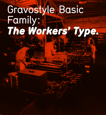 Gravostyle Basic is based on a transfer-sheet font (that was itself referring to swiss engraving fonts). The base font had only one weight. Originally drawn in 1999 as a rough multiple-master (named “Rubdown”), the font was tamed down and a slanted version drawn for the Optimo release. The idea was to keep an industrial touch without overstating it. By Niels Wehrspann, Lausanne.