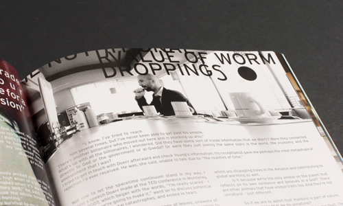 Nicht anders als erwartet hat das Magazin den »typischen Carson-Look«. Texte schwer lesbar, wilde Grafik, rebellisch, Surfbretter, die die Welt bedeuten ... Zum Thema der ersten Ausgabe, “Survival”, gibt es einige lesenswerte Artikel, aber auch recht viel Werbung (11 Seiten), die ich nicht erwartet hätte. Das Design erfreut sicher alle, die auch in den 90ern schon große Carson-Fans waren, denn ich finde, dass – im Gegensatz zu Meinungen aus anderen Blogs – es nach einem 90er Revival aussieht.