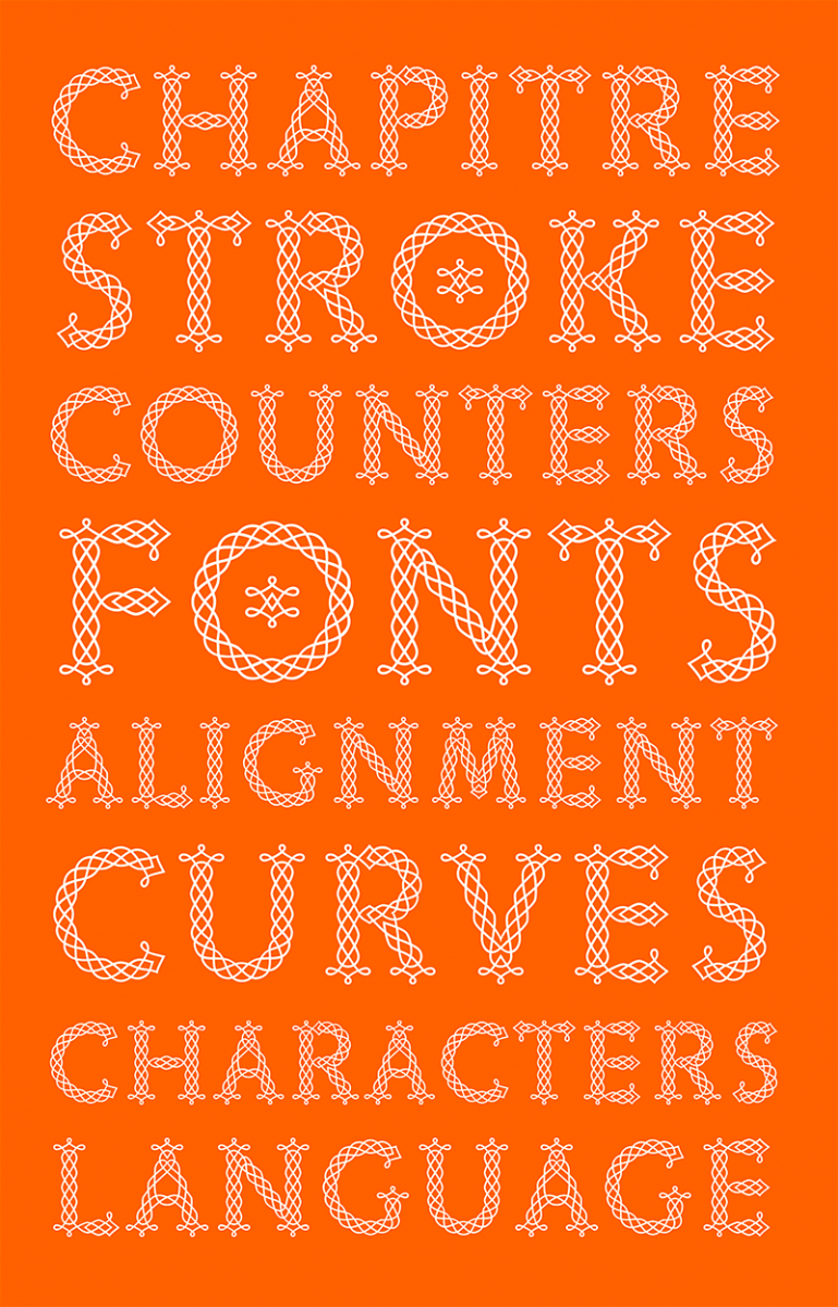 The typeface Chapitre is based on the principle of the endless knot, a symbol used particularly in Hinduism and Buddhism. As its name implies, an endless knot has no beginning and no end. Similar ornaments and patterns can be found in many other cultures at different times in history: Early Christian Ethiopian frescoes and bas-reliefs, Irish and Anglo-Saxon illuminations of the Middle Ages, Girih in Islamic art in the 11th and 12th centuries or Flemish calligraphy of the 17th century.