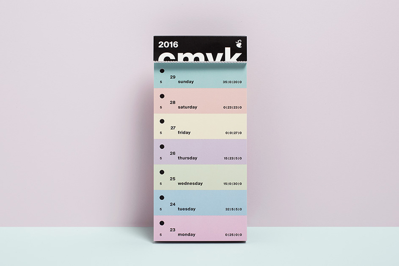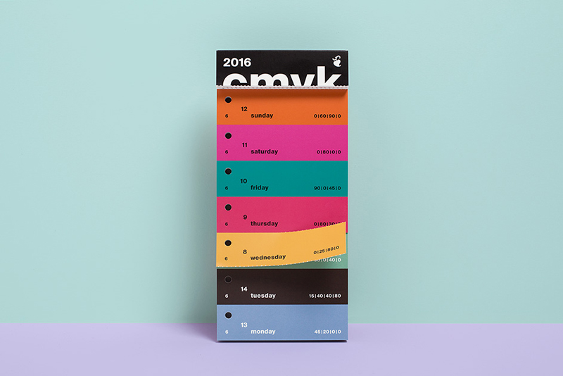 Der CMYK Color Swatch Calendar von Peter von Freyhold besteht aus wochenweise zusammengetragenen Tages-Farbstreifen. Gedruckt auf zweiseitiges Papier zeigen diese abtrennbaren Streifen die Farbwirkung auf gestrichenem und ungestrichenem Papier und geben die genauen CMYK-Werte der jeweiligen Farbe an. (Nutzen: farbsicher Druckjobs steuern!)