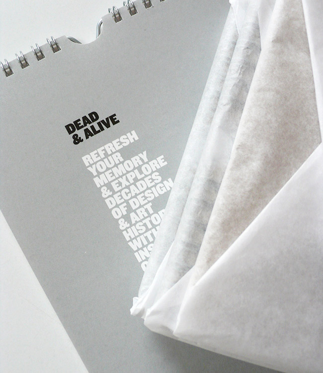 Dead and Alive – Der Geburtstagskalender mit 366 inspirierenden Persönlichkeiten aus der Welt der Gestaltung. Für alle Schussel, die gerne mal Geburtstage vergessen, für alle Entdecker, die an Kunst- und Designgeschichte interessiert sind und für alle Neugierigen, die immer schon wissen wollten, welcher Gestalter wohl an ihrem Geburtstag Geburtstag hat.