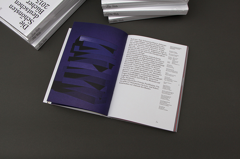 Die Stiftung Buchkunst gibt jährlich eine Wettbewerbsdokumentation heraus, den Katalog der »Schönsten deutschen Bücher«. Dieser wird jedes Jahr von einem anderen Designbüro gestaltet, dieses Jahr von der Agentur Herburg Weiland aus München. Die passenden Fotos lieferte das Studio Mierswa-Kluska ebenfalls aus München.