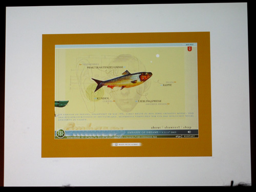 Er stellte einige (teilweise vergangene) Kundenprojekte vor, anhand derer er aufzeigte, wie fruchtbar und auch gleichzeitig kurzlebig Kundenbeziehungen sein können. So z.B. Arbeiten für “embassy of dreams”, eine Filmproduktion, für die er viele Kommunikationsmaßnahmen und die Website gestalten konnte, deren Wege sich jedoch irgendwann trennten, als die Erwartungshaltung von beiden Seiten nicht mehr übereinstimmte. Seine Kundenbeziehung zur FDP Bundestagsfraktion, für die er viele Broschüren gestaltete, bezeichnete er hingegen als »wir saßen im selben Boot.« In wilder Ehe lebte er mit der Landeszentrale politischer Bildung NRW, bei der es einmal jährlich so richtig »krachte.« Oder auch das Filmfestival Max Ophüls Preis, für das er 5 Jahre lang alle Kommunikationsmaßnahmen gestaltete und durch einen Wechsel in der Führung seinen, das Verhältnis abrupt beendet war.