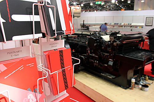 Kurz vor der Typo Berlin war ich in Düsseldorf auf der Drupa. Beeindruckend: Heidelberger. Der Markführer überzeugt durch Design, Größe und Stil. Und Sport: alle Demo-Druckerzeugnisse sind von adidas. Kaum zu glauben, dass vor paar Jahren noch ganz anders gedruckt wurde, wie auf dem 300 qm Stand des Leipziger Typografie Museums zu sehen, auch in rot, nur eben etwas anders :-)