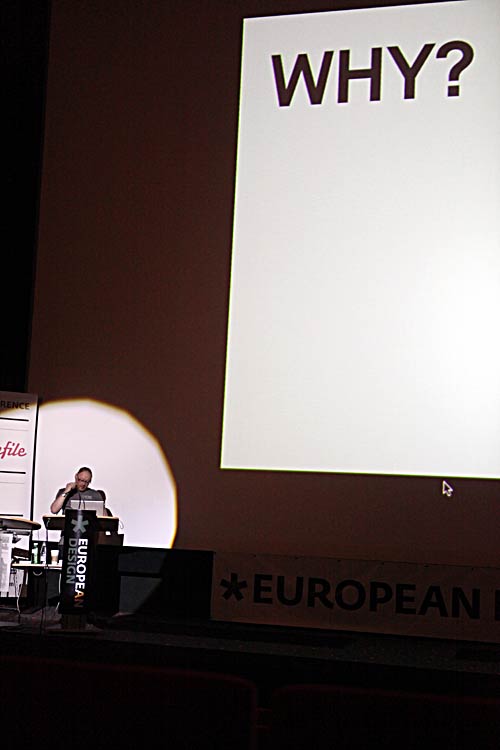 Geladen wurde dieses Jahr in einen modernen Kinopalast, Mittelpunkt eines konstruierten Ortsteils von Zürich - die sonst so charmante Stadt hätte hier sicherlich einige besser Alternativen zu bieten gehabt! Über eine Rolltreppe und vorbei an diversen mit Neonlicht angestrahlten Filmplakaten gelangte man in den für die Konferenz gebuchten Saal. Das Präsentationsformat entsprach den vergangenen Jahren: Die Sprecher waren gebrieft, innerhalb ihres 45 minütigen Vortrages, sich selbst bzw. ihr Unternehmen vorzustellen, einen kurzen Überblick ihrer Arbeiten zu präsentieren und auf ein Projekt dann detailliert einzugehen - vom Kundenbriefing über die Ideenfindung bis hin zur Umsetzung. Jeder Präsentation folgte eine kurze Talkrunde. Publikumsfragen waren willkommen, eine Interaktion fand jedoch nur mühevoll statt.