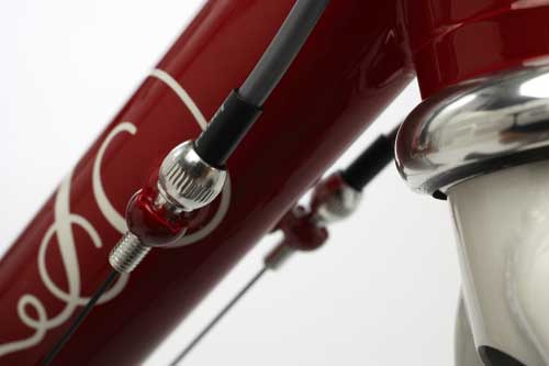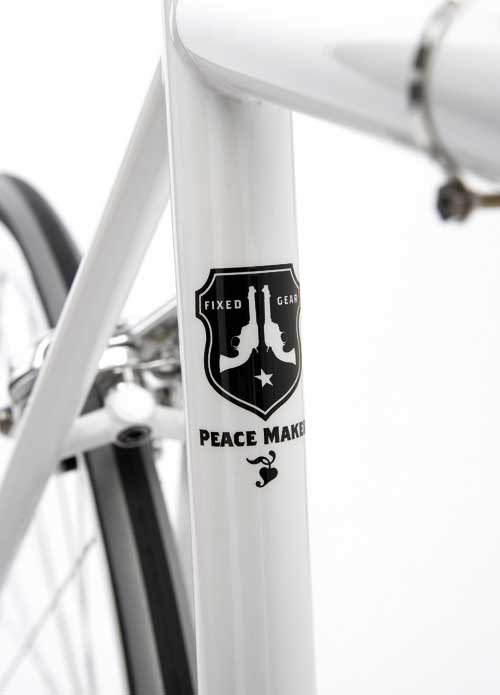 Das besondere an den beiden Race-Modellen: das asymmetrische Labeling. Während Mitbewerber das Rahmendesign oft mit monströsen Aufklebern überlasten, wurde bei den Modellen von FIXIE Inc. ein anderer Weg eingeschlagen: ungewöhnliche Auswahl der Schrift (Dalliance von Emigre) und unterschiedliche Platzierungen (auf der Kurbel-Seite befindet sich das Logo klassisch auf dem Unterrohr während es auf der anderen Seite auf dem Oberrohr neben der Logo-Banderole angebracht wurde.)