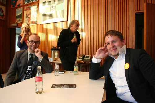 Alle Sprecher wurden mit kleinen Filmen angekündigt, die von Studenten der Sint Lukas Schule sehr individuell gestaltet wurden und jeweils Bezug zur Arbeit der vorgestellten Person nahmen. Zwei davon, für Art+Com und Dan Perjovschi, konnte ich auf YouTube finden.
