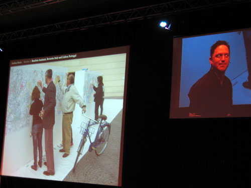 Joshua Davis, der vor allem Flash und Illustrator für seine Arbeiten nutzt und häufig in der Natur nach Inspiration sucht, hielt zum Thema »Space« einen Vortrag in der gut gefüllten Hall. Und das, obwohl er eigentlich gar keine Typo mag und auch nicht gerne liest. Wegen des Themas Space, das nach Google-Suchergebnissen alles und nichts sein kann, kam er jedoch gerne nach Berlin.
