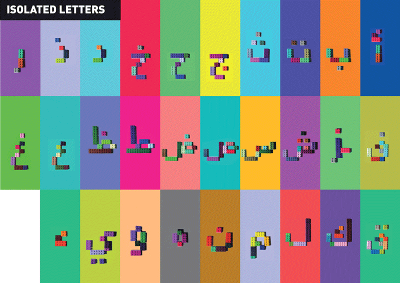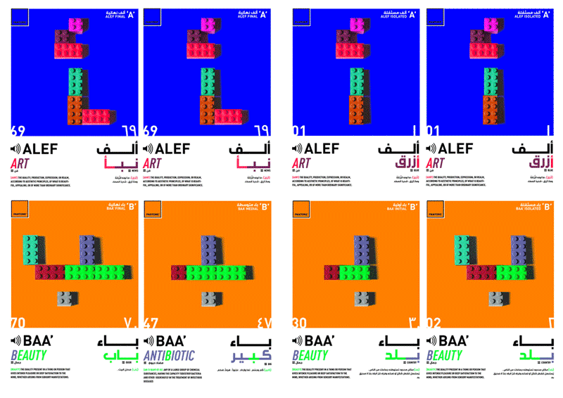 Die Ägyptische Designerin Ghada Wali hat es sich zur Aufgabe gemacht die Arabische Sprache spielerisch zu vermitteln. Mit dem Einsatz von Lego-Steinen, sollen vor allem Kinder die Schriftzeichen verstehen und leichter erfassen können. Sie hat ein System entwickelt, das in einem Taschenbuch die Schriftzeichen in all ihren Ursprungs-, Übergangs- und Finalformen zeigt. Dazu kann man sich auch die Laute der Zeichen anhören und parallel nachahmen. Dadurch kommt es zu einem ganzheitlichen Lernen.