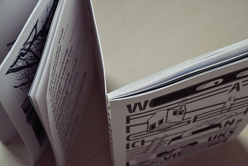 Nach dem Motto »Der Anfang ist die Hälfte des Ganzen« hat das Magazin zwei Leserichtungen, zwei Teile, zwei Inhalte. Durch eine offene Fadenheftung zusammengehalten und an den Buchrückseiten verbunden, muss die Broschüre zum Lesen des zweiten Teiles gewendet werden. So ist es dem Leser freigestellt, an welchem Anfang er beginnen möchte.