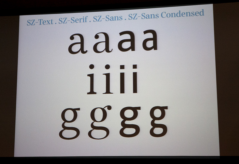Tiefe Einblick gewährte Henning Skibbe in seinem Vortrag zu der Entwicklung der Schrift für die Süddeutsche Zeitung. »Wie Schrift komplexe Dokumente entschlüsselt«, was ist entscheidend wenn man die Typografie, ein so wichtiger Teil einer Zeitung, ändert? Erst war die Miller als neue Schrift der SZ angedacht um die alte Excelsior abzulösen. Die Idee der Schrift war gut, nur nicht vereinbar mit dem gewohnten Grauwert der Zeitung. Skibbe beschreibt wie der Prozess, eine hauseigenen Schrift zu entwerfen, von statten geht. Welche vielen Kleinigkeiten alle beachtet werden müssen, damit die Stammleserschaft erhalten bleibt. Die SZ-Schriftfamlie schließt viele Lücken der alten Schrift und bietet nun die passende Antwort um das komplexe System einer Zeitung zu bedienen.