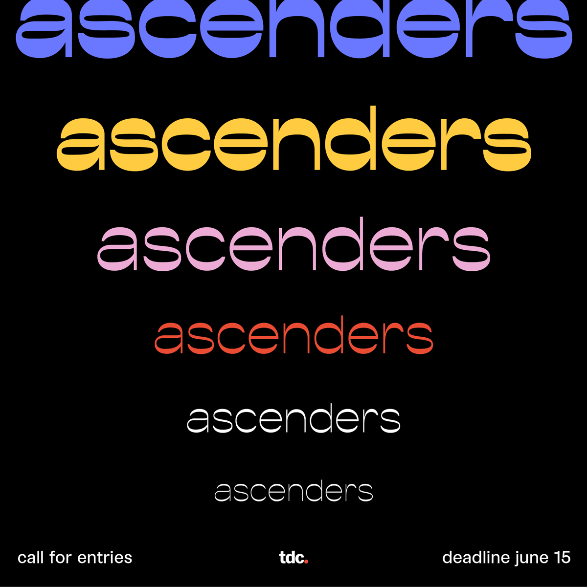 Members of the TDC Board of Directors will review all submitted work and select ten aspiring and inspiring designers who are expanding the art of typography. Ascenders 2019 honorees will be announced on July 17, 2019 at the Type Directors Club annual awards ceremony at The Cooper Union in New York. The Type Directors Club will exhibit the Ascenders 2019 work, which will also be published in the TDC’s annual, The World’s Best Typography.